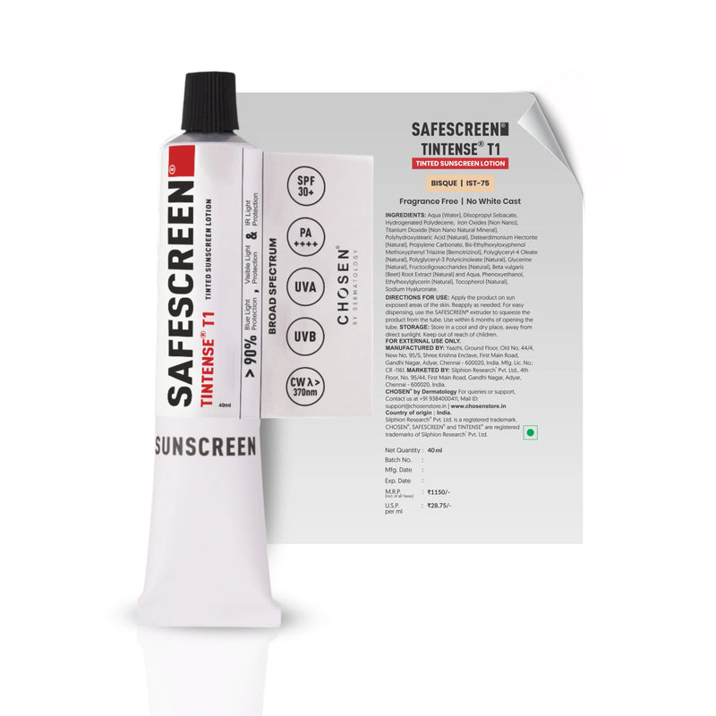 SAFESCREEN TINTENSE is a community cocreated tinted sunscreen range built specifically for Indian skin. It offers broad spectrum protection from UV, infrared, and high energy visible light while delivering natural looking coverage. Shades are developed using IST (Indian Skin Tone), a science based tone matching method built on melanin index analysis and real world user testing. TINTENSE is available in both mineral and hybrid formats.