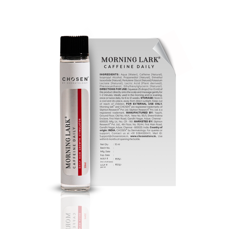 Morning Lark® Caffeine Daily Solution is a topical caffeine solution for hair formulated to stimulate the anagen (growth) phase of the hair. An extended growth phase offers lesser shedding, increased thickness of hair strands, stronger, healthier, and shinier hair. Existing hair gets thicker and stronger and grows at a faster pace. Clinical studies have proven that caffeine helps arrest hair loss and promotes growth when applied topically on the scalp.