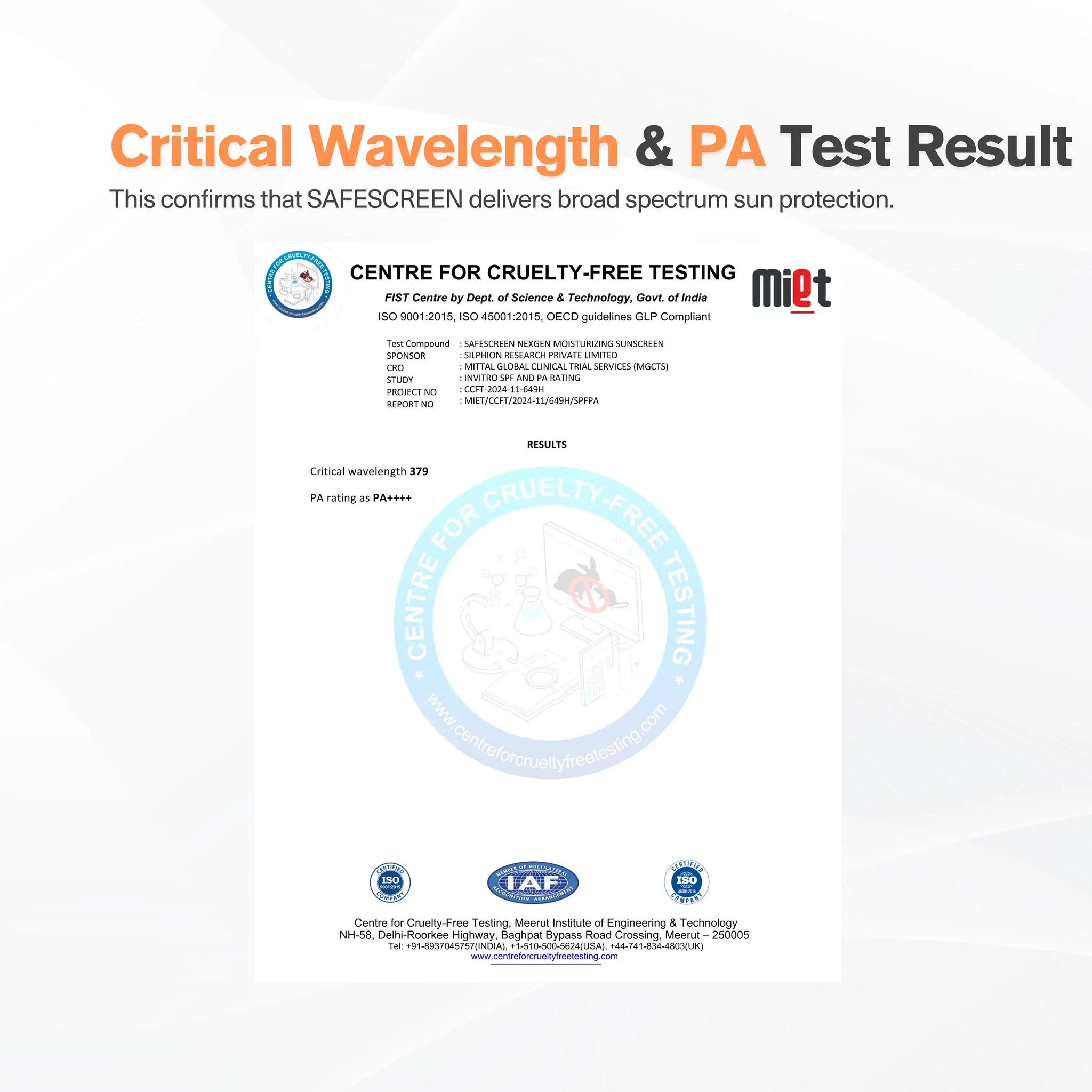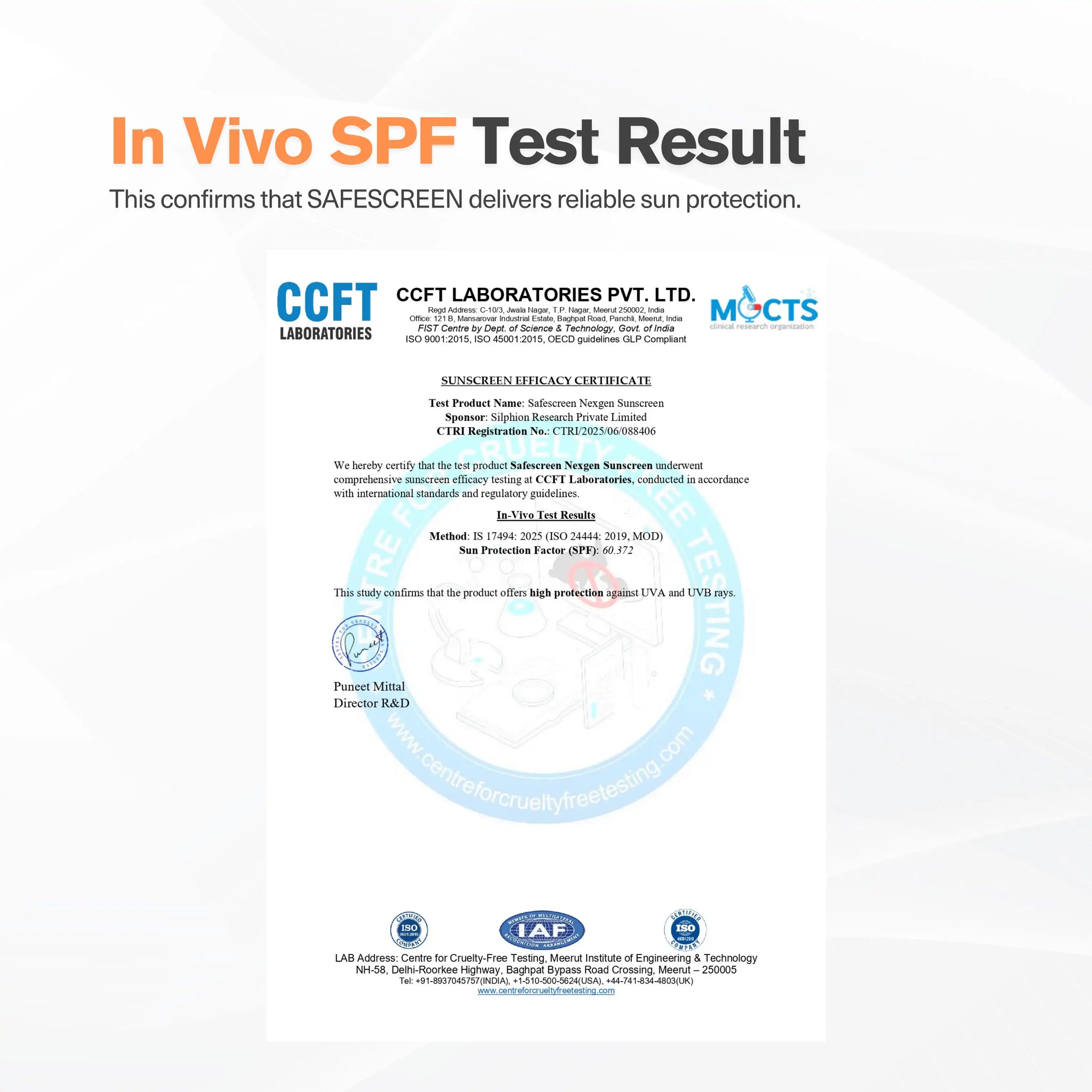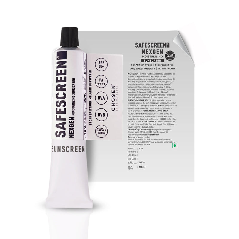 To ensure reliable performance, SAFESCREEN Nexgen undergoes both in-house and independent third party testing to ensure validated UV protection. At CHOSEN, its UV blocking performance is assessed using the Labsphere UV Transmittance Analyzer. In addition, it is evaluated at accredited independent laboratories under established in vitro standards (ISO 24443 and IS 17493) and in vivo standards (ISO 24444 and IS 17494) for objective and comprehensive assessment. Third party testing certificates are available in the Images section of the product page.