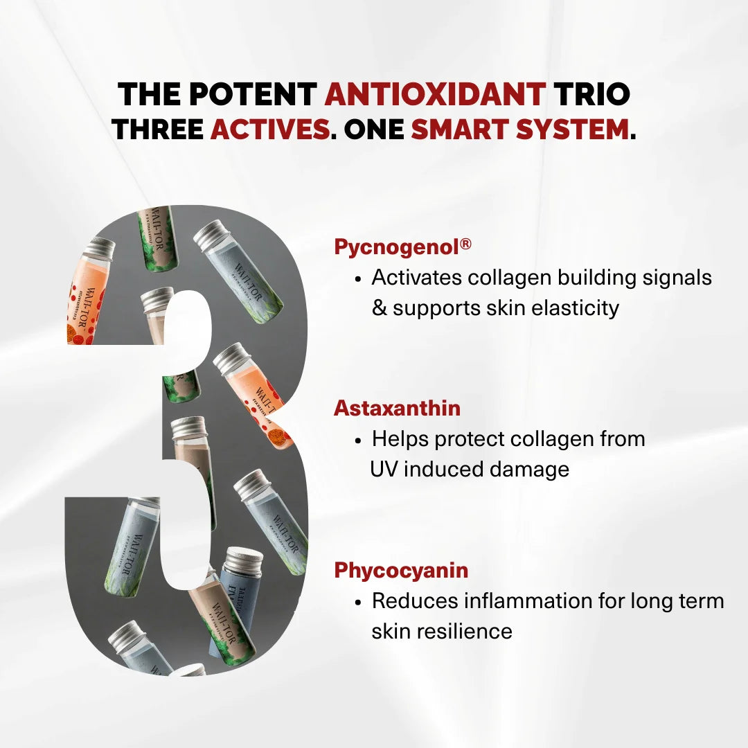 WAH TOR works as a plant-powered antioxidant trio that helps your body support collagen in three ways: build, protect, and preserve. It doesn’t contain collagen (since collagen is animal derived). Instead, Pycnogenol helps activate collagen-support signals and supports hydration pathways, Astaxanthin helps protect existing collagen from UV- and pollution-linked oxidative stress, and Phycocyanin helps calm low grade inflammation that can weaken collagen over time. Used consistently, it supports skin that looks firmer, healthier, and more radiant.