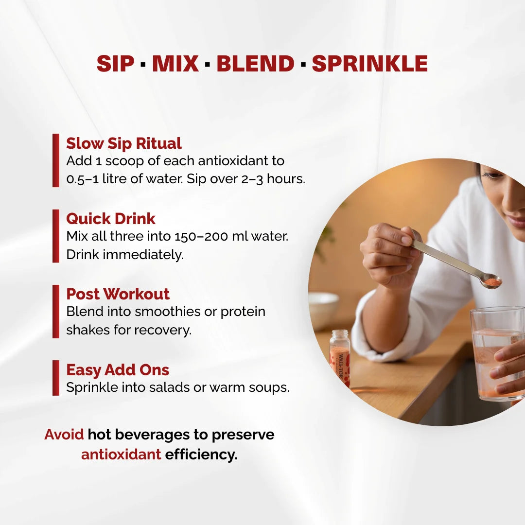 Add one scoop each of the three actives into a 0.5–1 litre water bottle. Sip it over the next 2–3 hours – like a refreshing, functional flavoured drink.