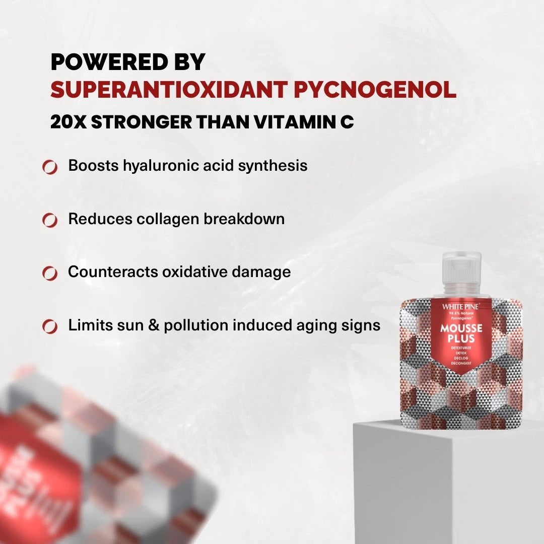 White Pine® Mousse Plus is a topical Pycnogenol® application that declogs pores decongests and detexturizes the skin and is a great topical skin detox.